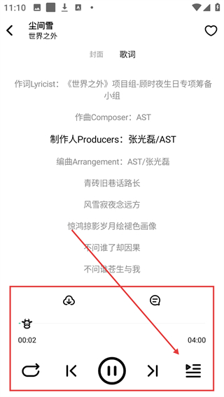 3、进入歌曲播放页,能看到歌词和播放控件,用底部按钮可控制播放、切歌,还能设置播放模式呢。