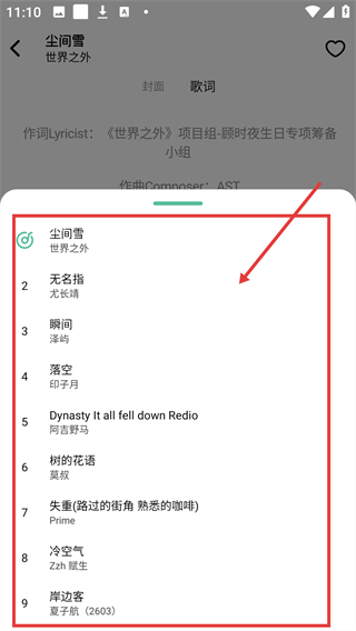 4、在播放页点歌单按钮,能展开当前榜单的歌曲列表,随时切换想听的歌曲,听歌更灵活哦。