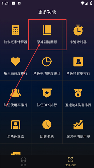 1、在“更多功能”页面选择“圣遗物/伤害排行”。