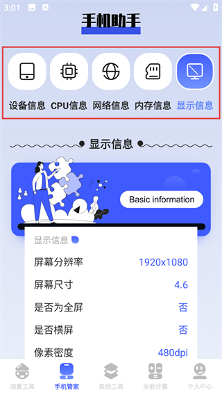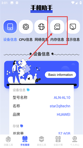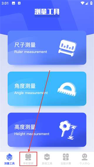 1、在测量工具页面,点击底部的【手机管家】选项,切换到手机助手界面,可查看设备相关信息啦。