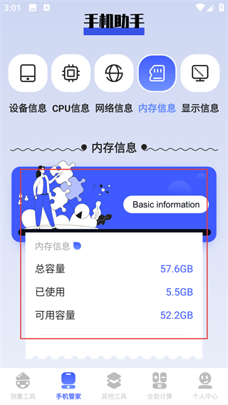 2、进入手机助手界面后,点击【内存信息】选项,即可切换到内存信息板块,查看手机内存的详细数据哦。