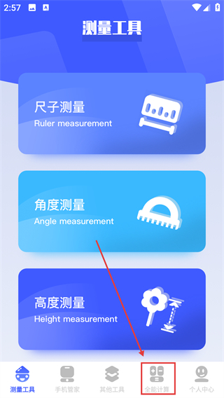 1、在测量工具页,点底部【全能计算】选项能切换到计算功能区,可使用各类计算相关工具哦。