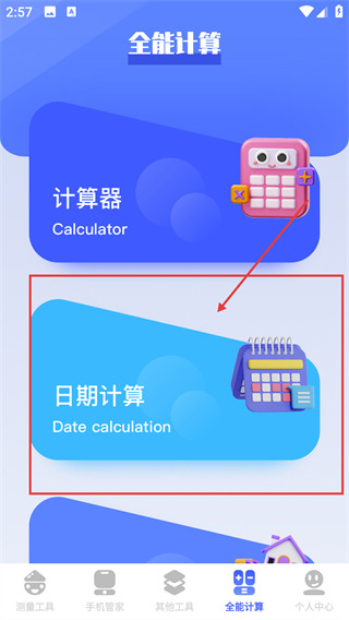 2、进入全能计算页后,点【日期计算】选项,就能进入日期相关的计算功能页面啦。