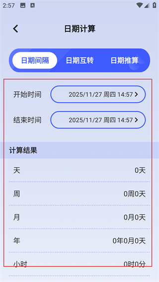 3、在日期计算页选【日期间隔】标签,设置开始和结束时间后,就能看到两者的时间差结果啦。