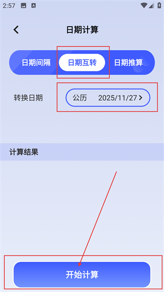 4、切换到【日期互转】标签,选好转换日期后点【开始计算】,就能完成日期类型的转换啦。
