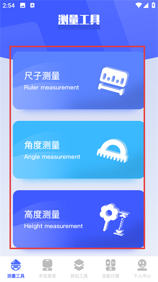 1、进入工具应用的测量工具页后,能看到【尺子测量】【角度测量】【高度测量】等功能,点击对应选项就能使用啦。