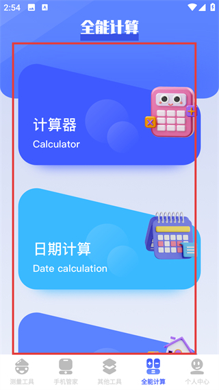 4、切换到全能计算页,能看到【计算器】【日期计算】等功能,点击对应选项就能开启计算工具啦。