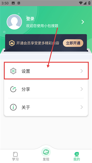 1、通过底部菜单栏进入小包搜题设置页面,点击设置选项;