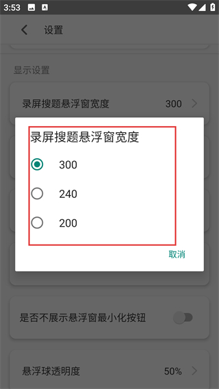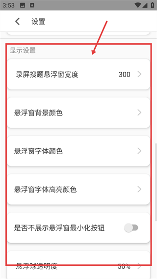 3、在设置页的显示设置板块,能看到【录屏搜题悬浮窗宽度】等选项,可自定义悬浮窗的样式哦。