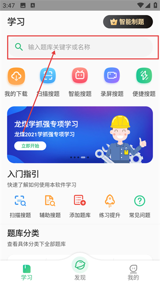 1、在学习页面,点击顶部的搜索框,就能进入题库搜索界面,准备查找目标题库啦。