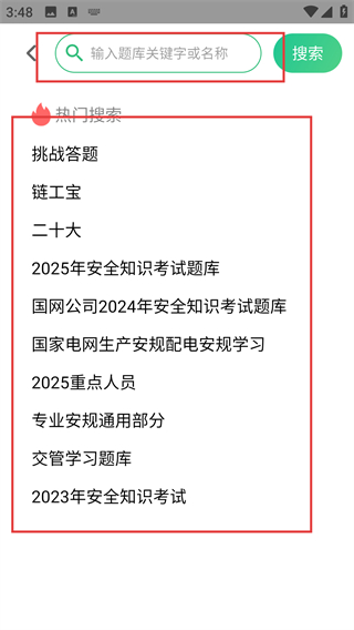 2、进入搜索页后,能看到热门搜索列表,直接选择对应题库关键词,就能快速定位目标内容哦。