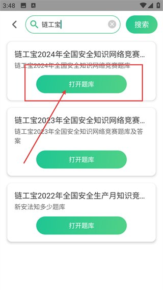 3、搜索结果页会显示对应题库,点击目标题库下的【打开题库】按钮,就能进入该题库的详情页啦。
