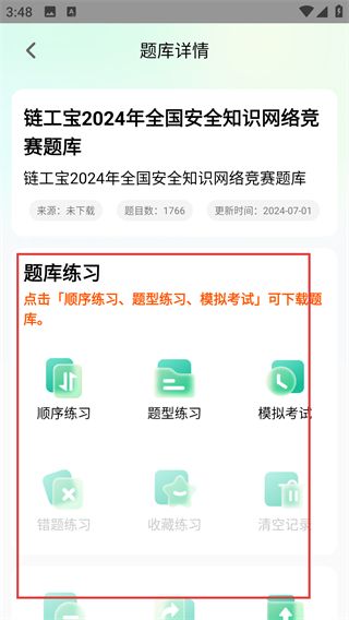 4、在题库详情页,可选择【顺序练习】【题型练习】等功能,开始使用题库进行学习练习哦。