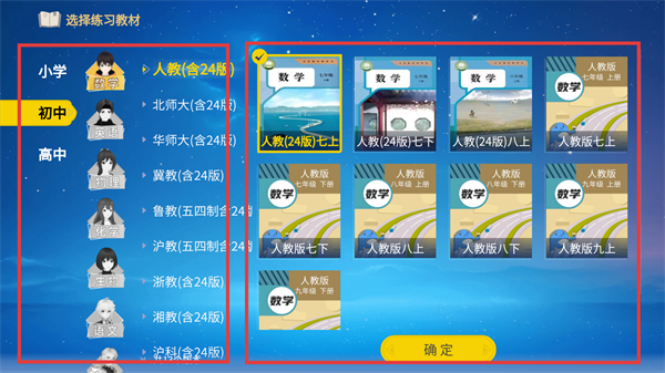 3、在选择练习教材页面,选定对应版本的教材(如【人教(24版)七上】),点击【确定】就能进入该教材的练习界面呀。