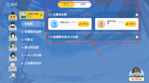 4、进入练习界面后,选择目标知识点(如【1.1正数和负数】),点击【去练习】按钮,即可开始该知识点的习题训练啦。
