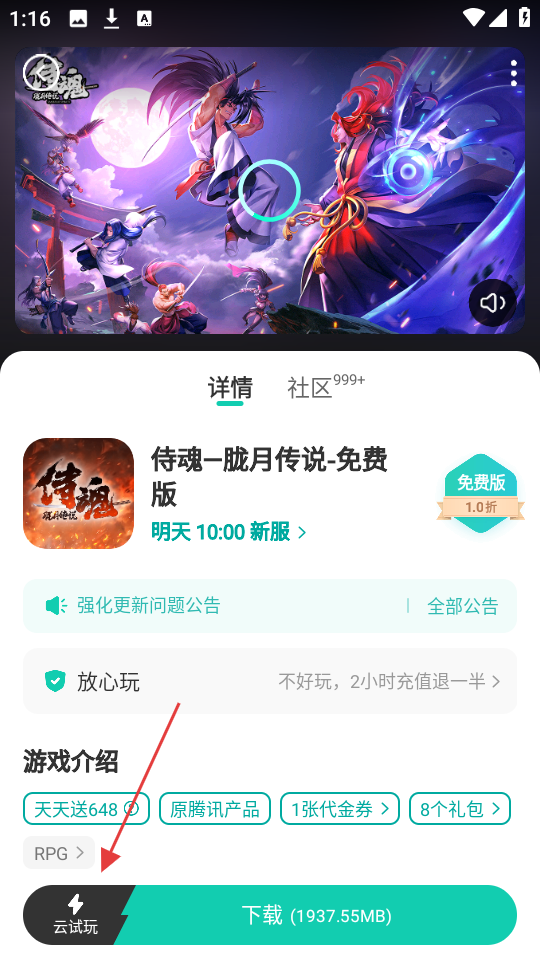 2、进入游戏详情页后,点击【云试玩】,可进入实名认证页面,准备进行实名认证哦。