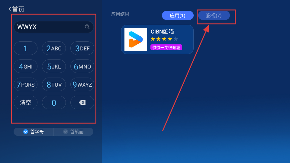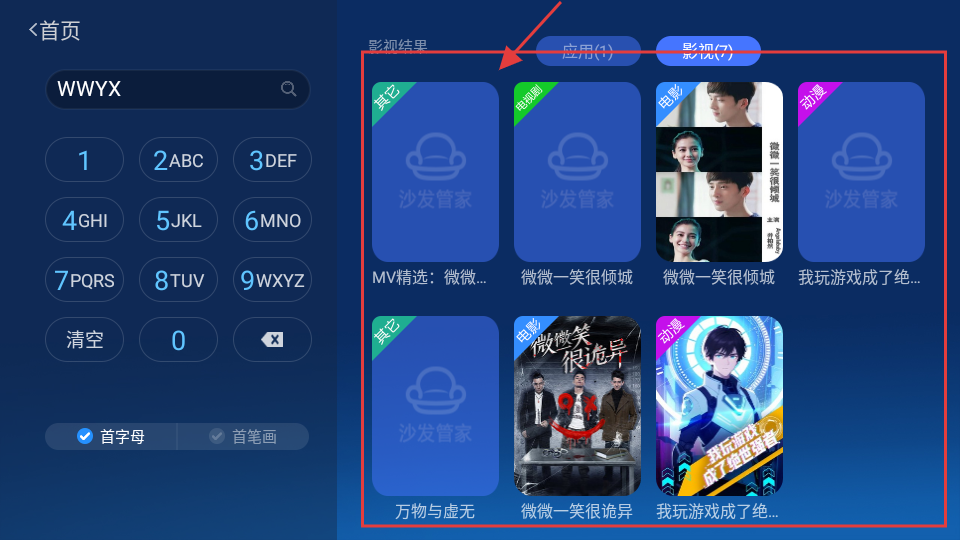 2、进入搜索页面后,输入内容,如WWYX,可查看搜索结果,点击【影视】可筛选影视类结果哦。