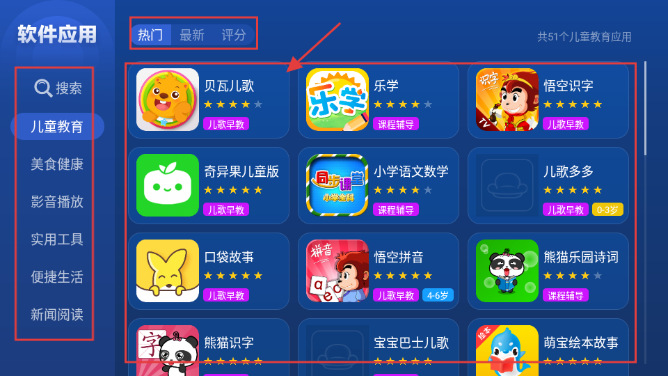 3、进入儿童教育分类页面,可按热门、最新、评分筛选应用,比如【贝瓦儿歌】就很适合哦。