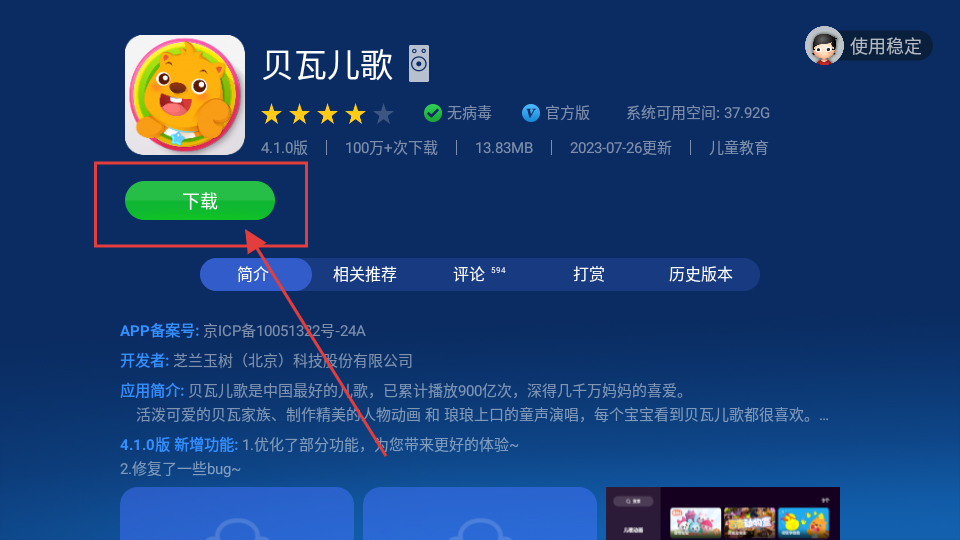 4、进入【贝瓦儿歌】详情页,点击【下载】按钮,即可开始下载该应用啦。