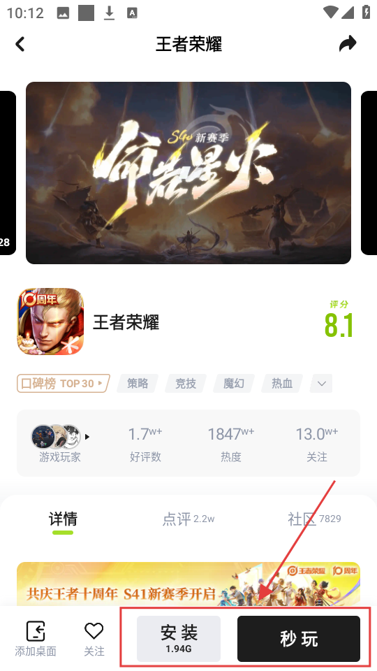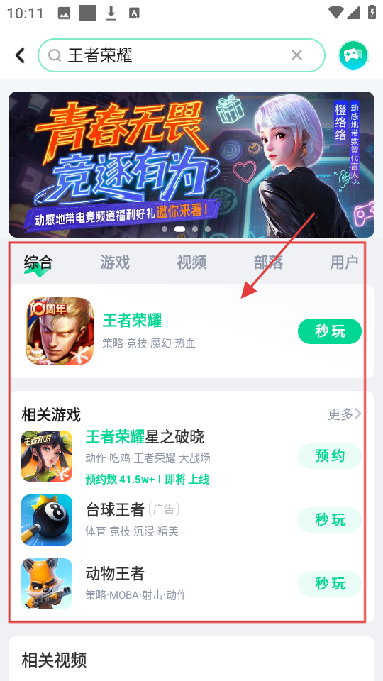 3、在搜索结果页面,点击【王者荣耀】游戏,可进入游戏详情页,了解游戏相关信息啦。