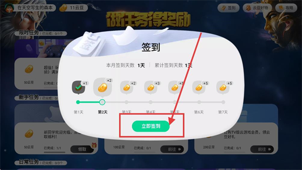 3、在任务奖励页面,点击【立即签到】按钮,完成当日签到操作,可获得对应的签到奖励啦。