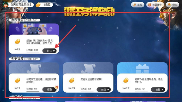 4、签到完成后,查看页面中的任务列表,点击任务旁的【前往】按钮,可参与对应任务获取更多奖励呀。