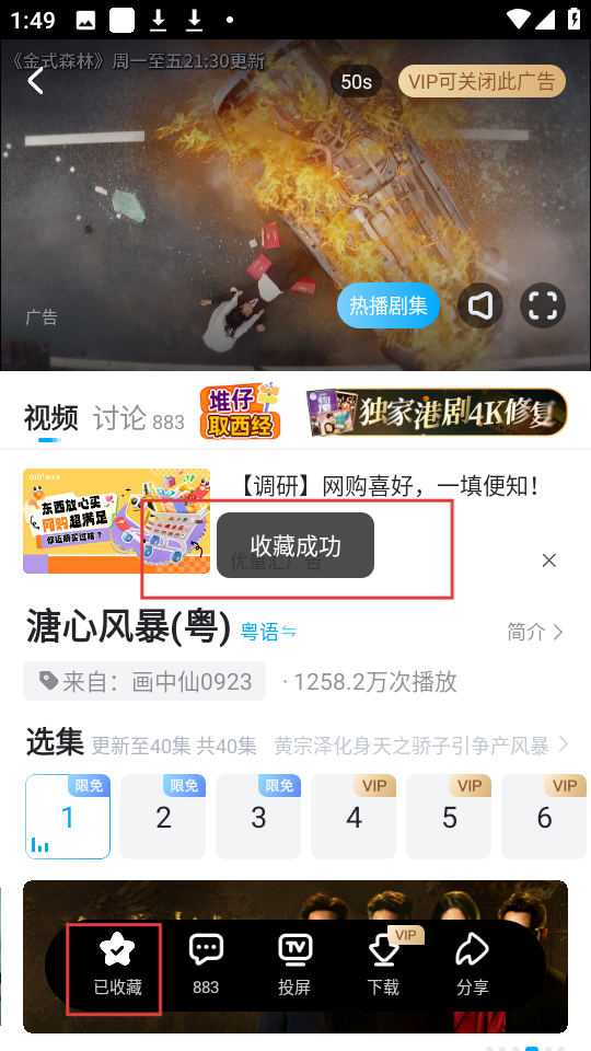 3、点击【收藏】后,会看到【收藏成功】的提示,这说明剧集已经被成功收藏啦,是不是超有成就感。