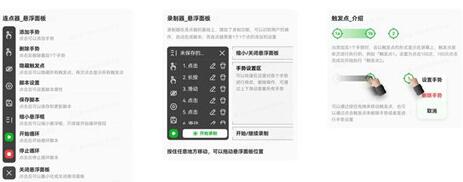 通过添加手势可以添加点击、长按、滑动、多点点击等手势,创建好的手势将以「触发点」的形式显示在屏幕上,可以通过点击触发点进行删除、修改设置等操作。