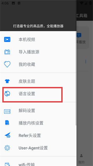 2、展开菜单后点击【语言设置】选项,就能打开语言选择的弹窗,准备切换应用的显示语言哦。