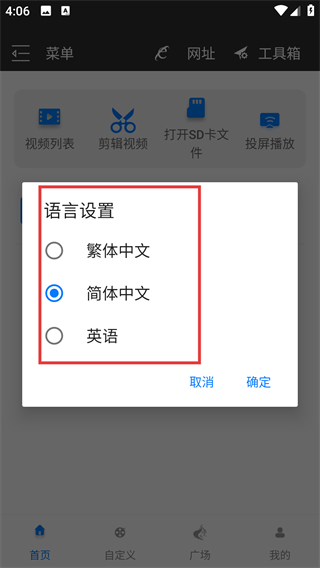 3、在语言设置弹窗里可选择【简体中文】【英语】等选项,选好后点击【确定】就能生效啦。