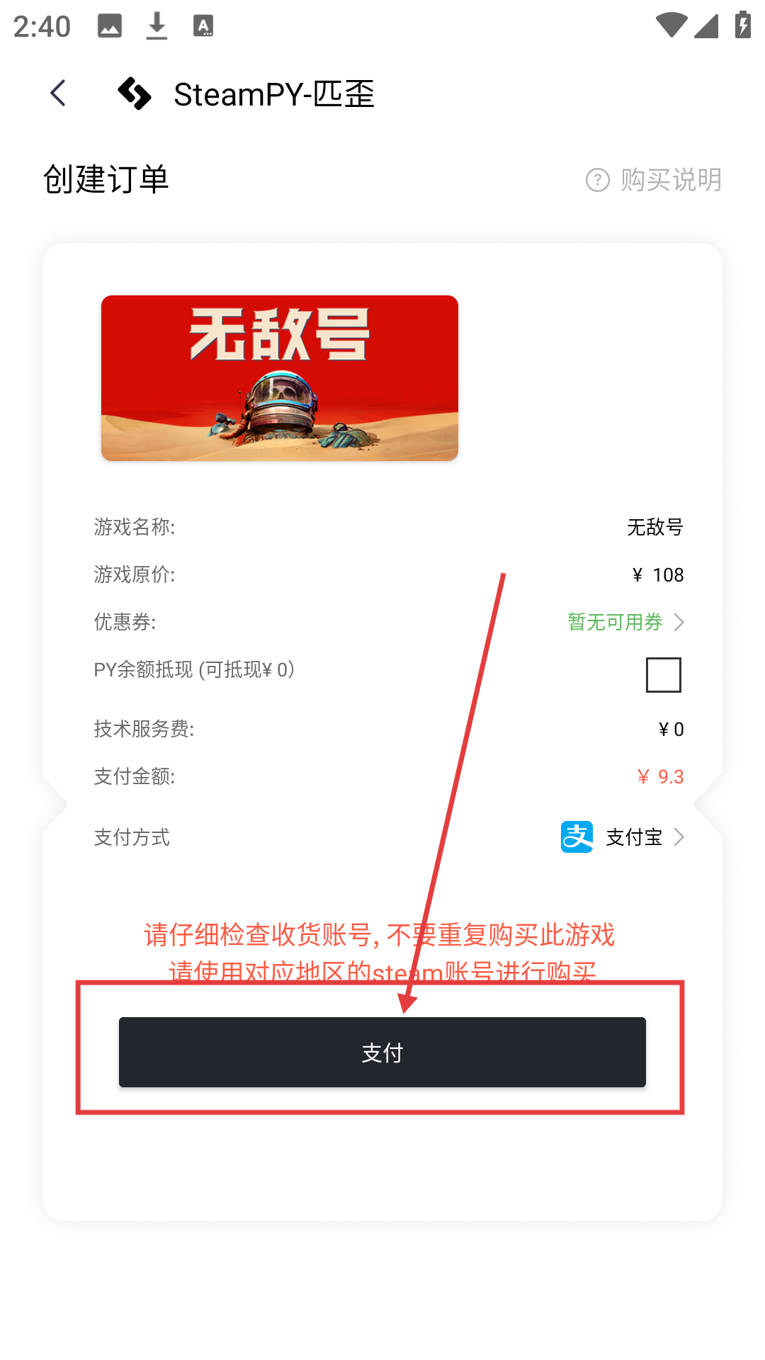 2、进入《无敌号》详情页后,点击【购买游戏】按钮,可进入创建订单页面啦。
