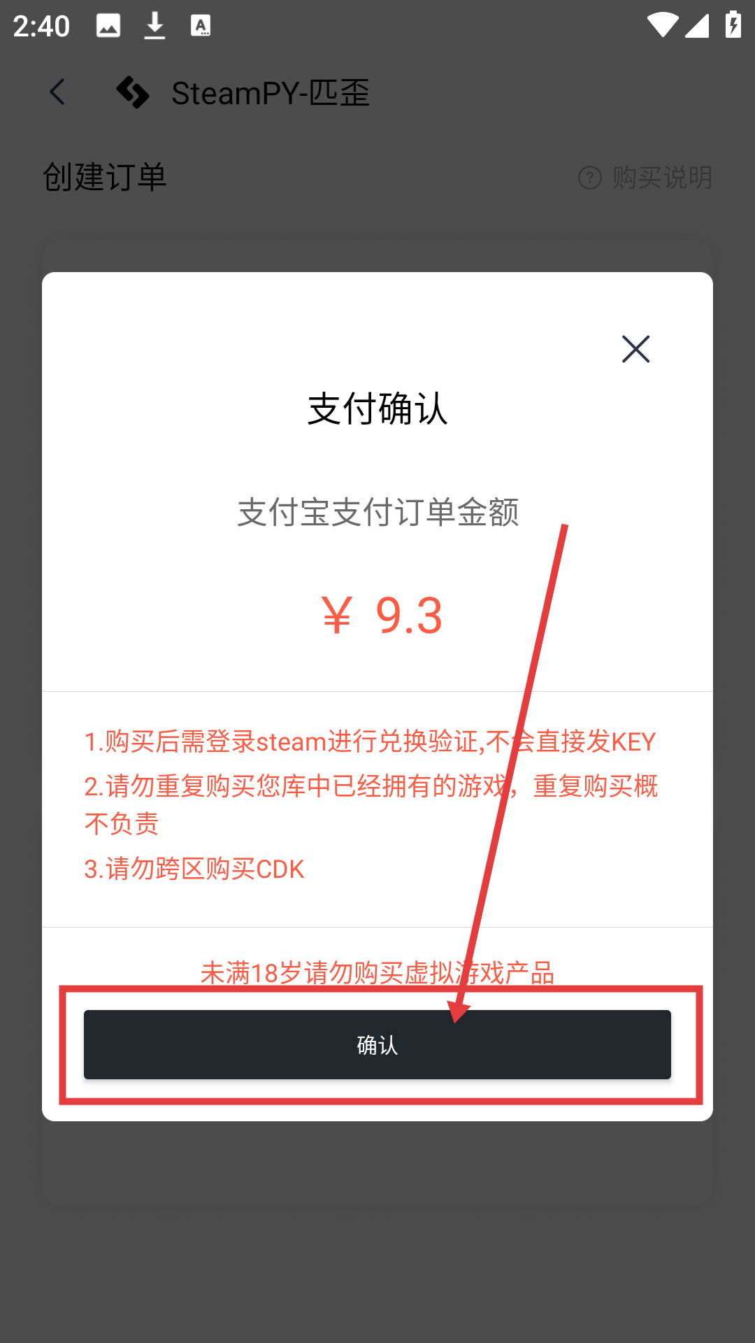 4、在支付确认页面确认支付金额和提示信息后,点击【确认】即可完成游戏购买啦。