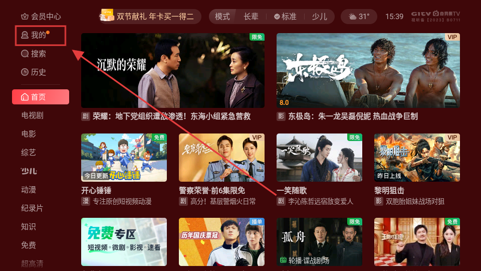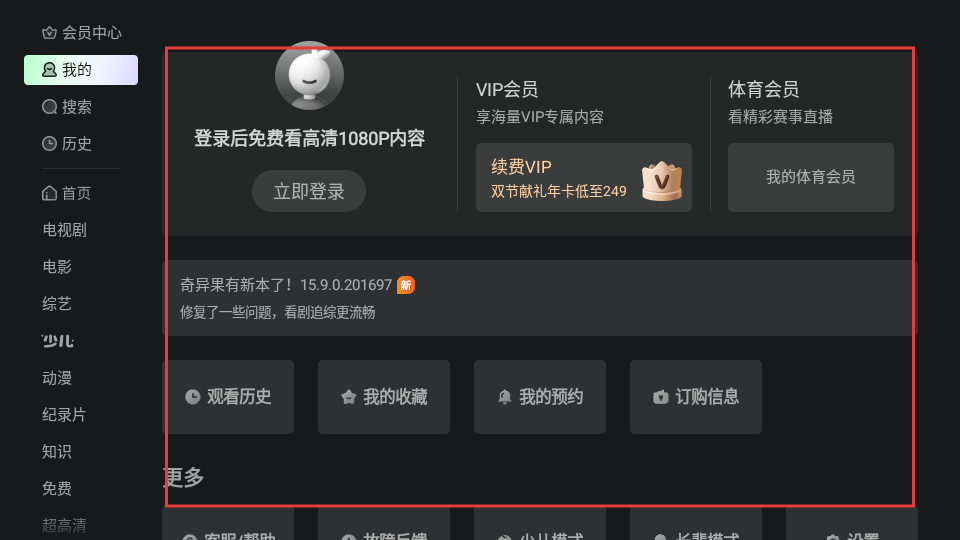 2、进入“我的”页面后,能看到登录提示、会员信息以及观看历史等功能入口,根据需求使用就行。
