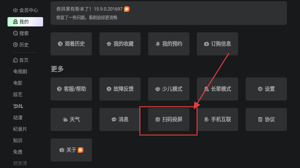 3、在“我的”页面的更多功能里,若想进行投屏操作,点击【扫码投屏】选项,就能进入投屏相关页面啦。