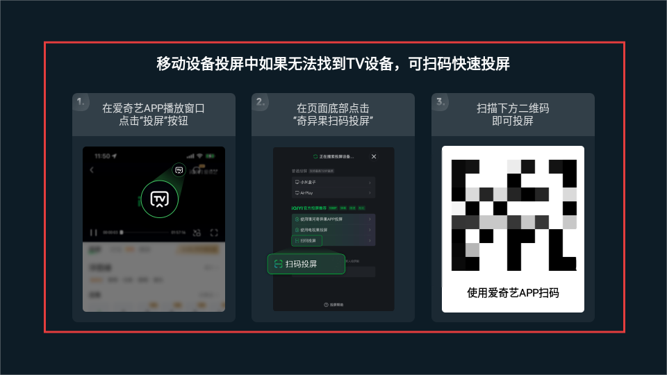 4、进入投屏页面后,按照提示在爱奇艺APP操作,扫描二维码,就能实现移动设备快速投屏啦。