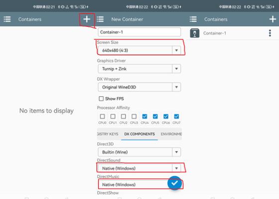 1、首先需要点击winlator右上角的“+”号创建容器,调节分辨率。