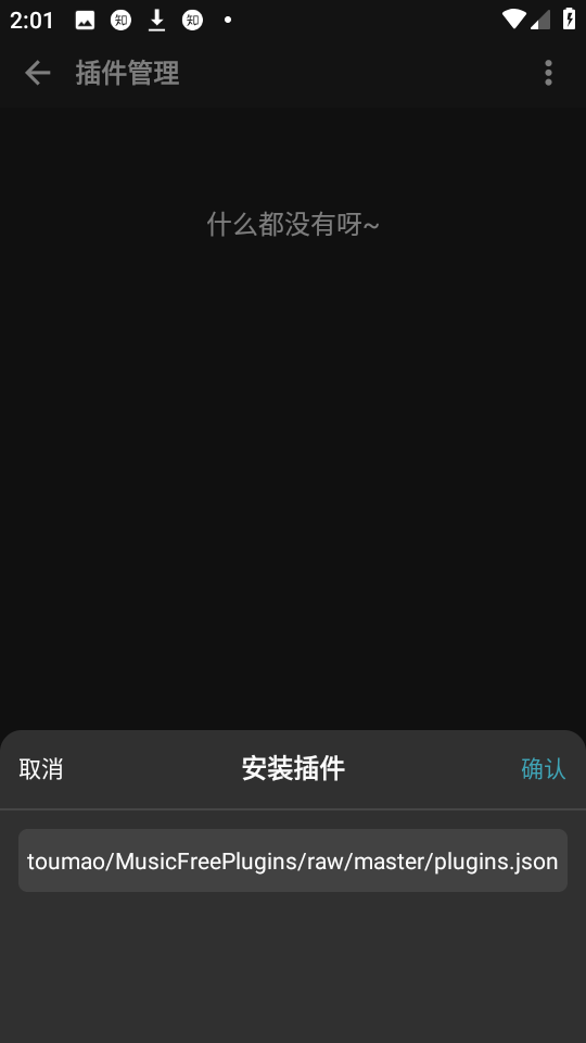 5、在输入栏里将这段网址粘贴进去点击确定:https://gitee.com/maotoumao/MusicFreePlugins/raw/master/plugins.json。