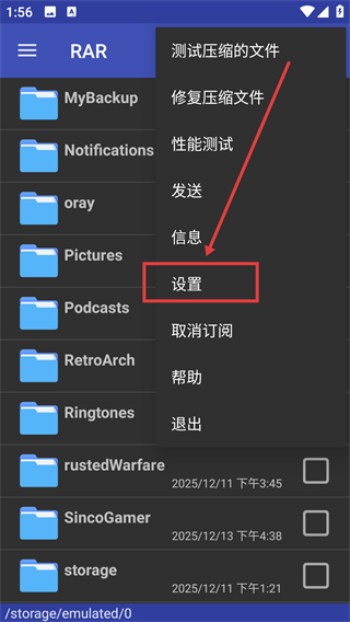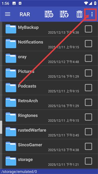 1、在【RAR】文件列表页点击右上角三点按钮,就能展开功能菜单,找到设置等操作选项啦。