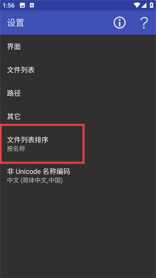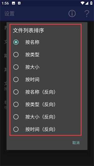 3、进入设置页后点击【文件列表排序】选项,就能打开排序方式的选择弹窗,更换列表排序规则啦。