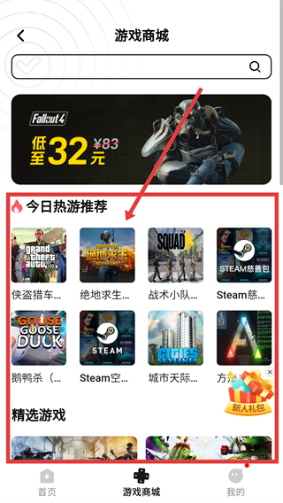 1、在APP首页,点击【游戏商城】,可进入游戏购买页面,准备挑选想入手的游戏啦。