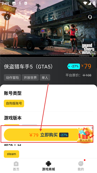 3、进入《侠盗猎车手5》详情页后,确认账号类型与版本,点击【立即购买】,可进入支付订单页面啦。