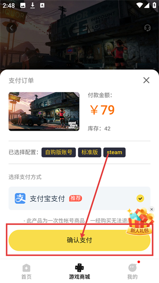 4、在支付订单页面,选择支付方式后点击【确认支付】,即可完成游戏的购买流程哦。