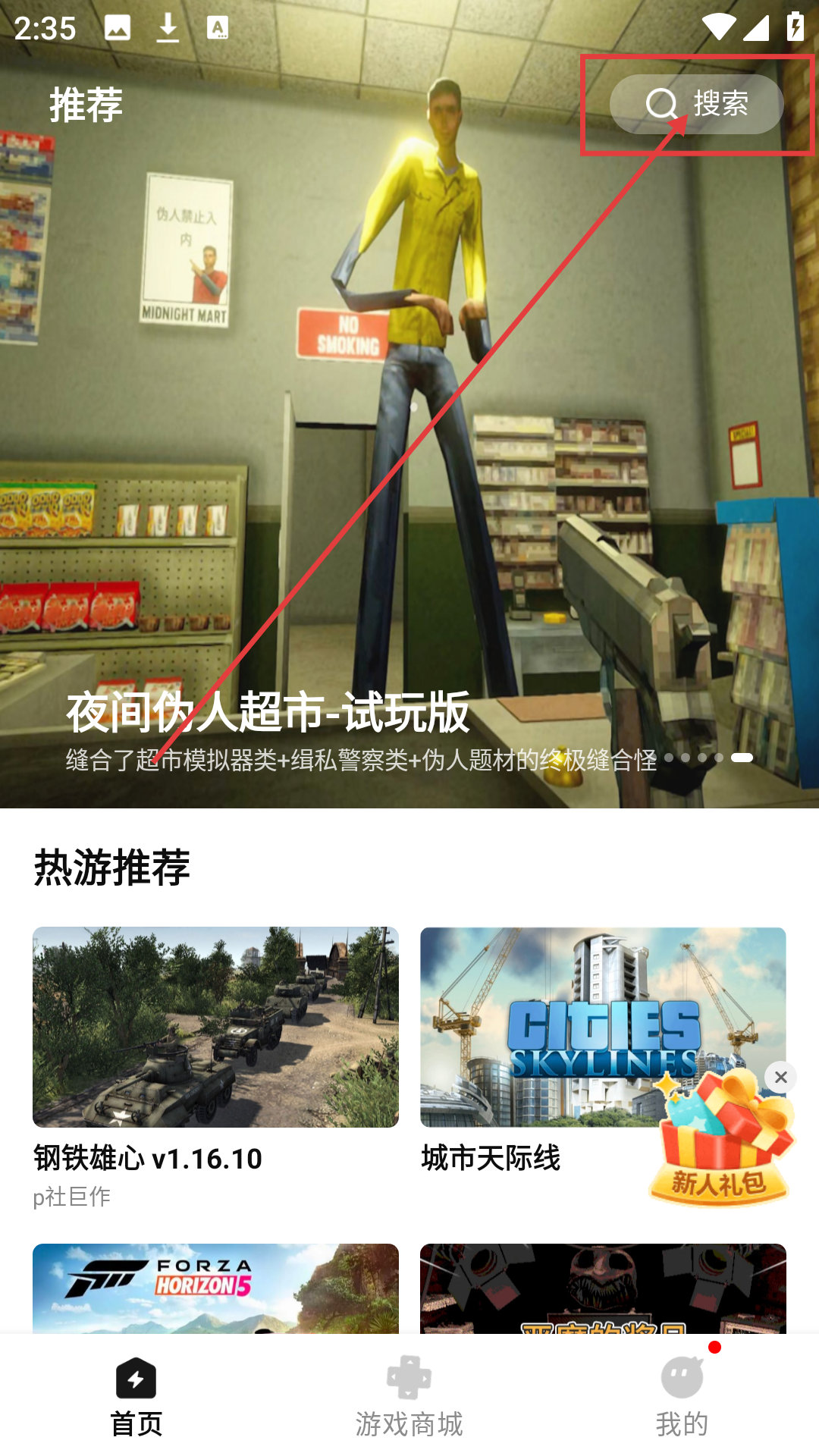 1、在首页点击右上角【搜索】,进入搜索界面,准备查找想玩的游戏哦。