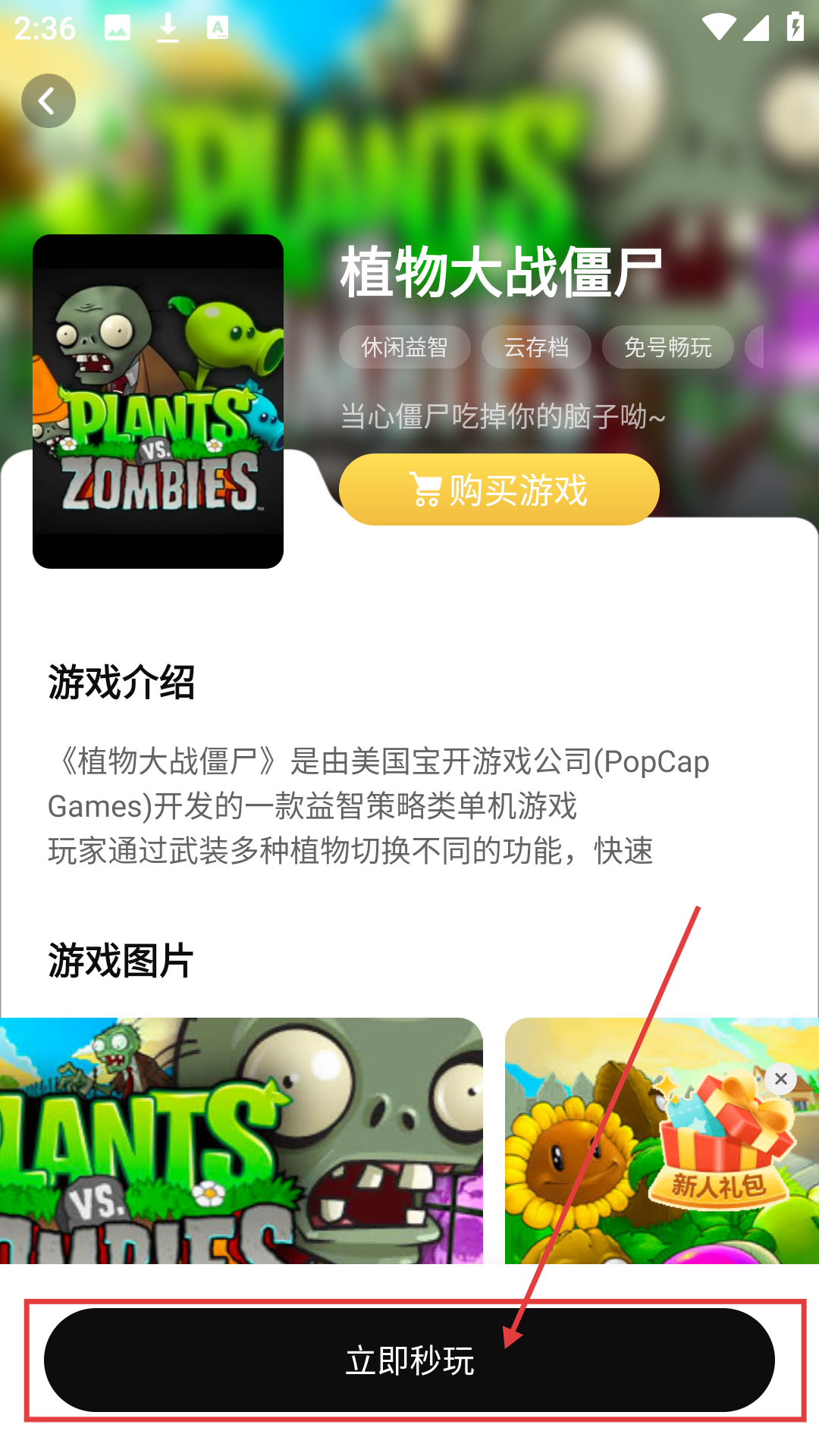 3、在搜索结果里选择想玩的游戏,如【植物大战僵尸】,进入该游戏的详情界面哦。