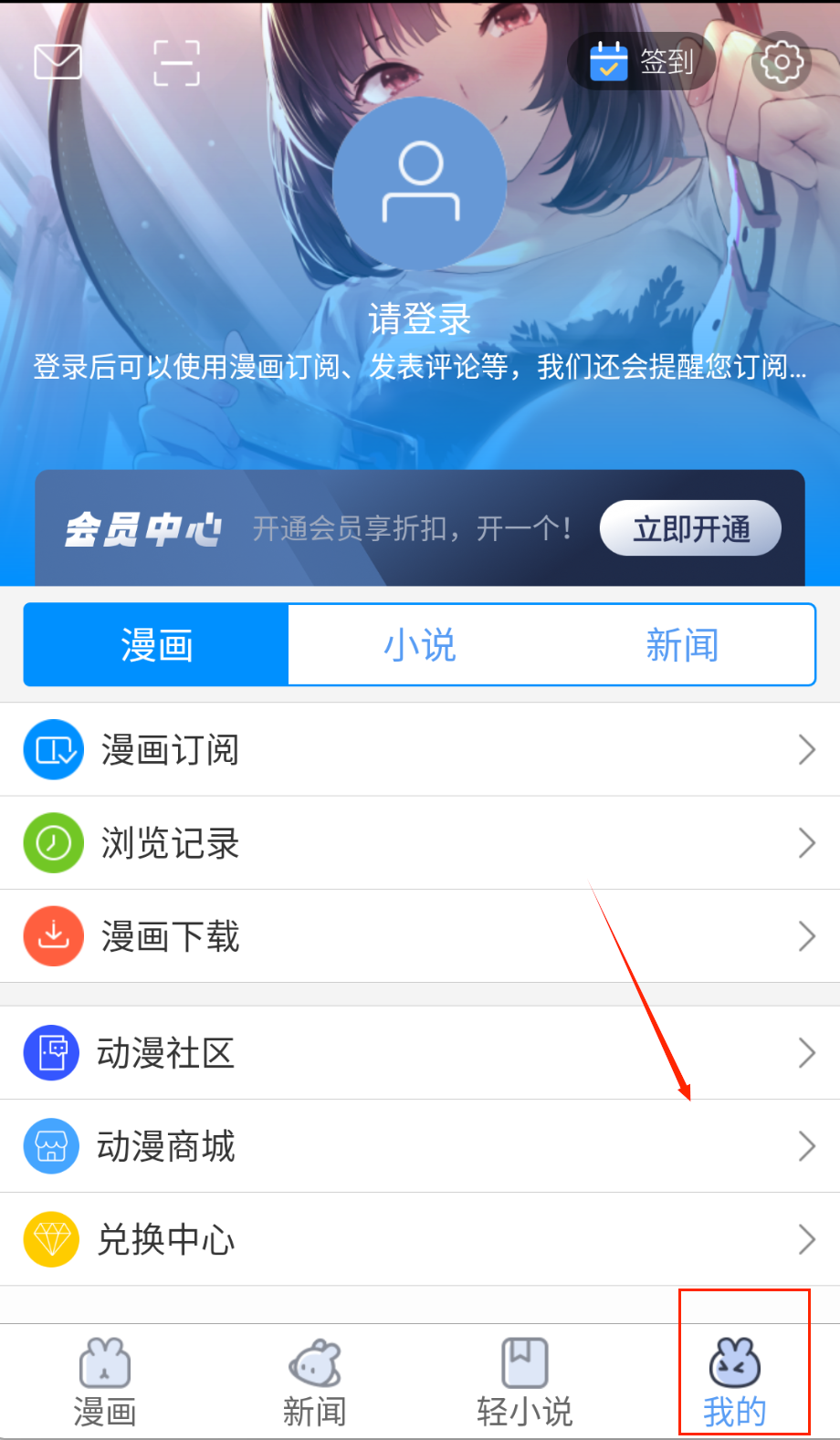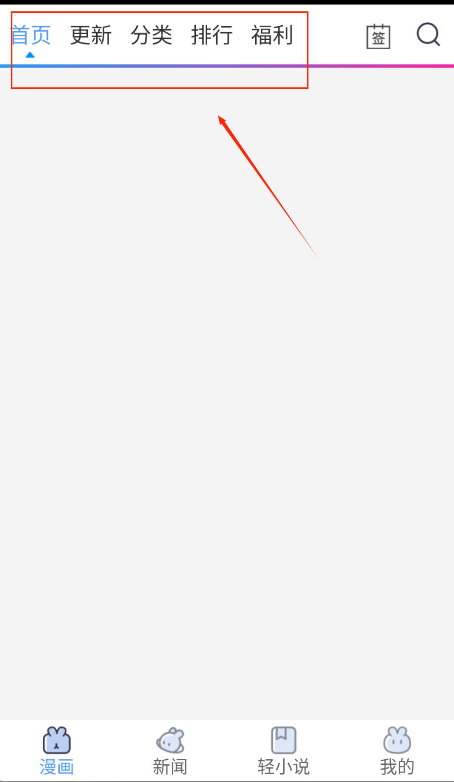 1、打开软件后首先看到底部导航栏有四个选项,分别是漫画、新闻、轻小说和我的,点击漫画图标进入主页面。