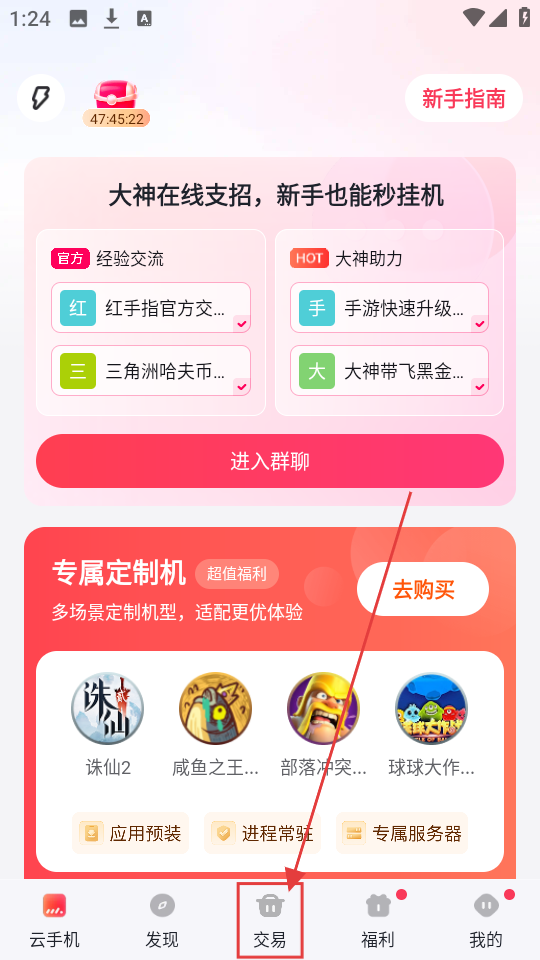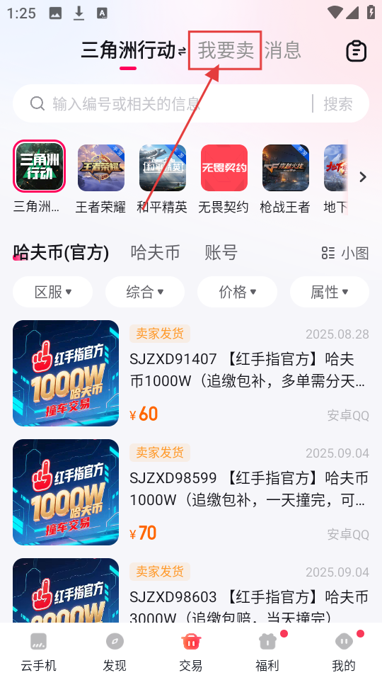 1、打开红手指应用,点击底部【交易】选项,进入交易页面开启卖哈夫币操作。