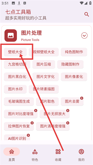 1、在七点工具箱首页,点【壁纸大全】选项,可进入壁纸分类页面,挑选喜欢的壁纸类型哦。