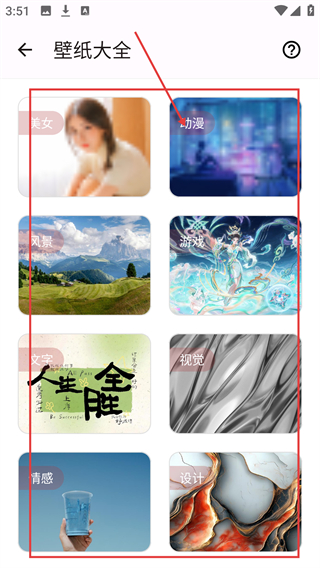 2、进入壁纸大全页后,能看到多种分类的壁纸,选【动漫】分类就能查看对应的壁纸资源啦。