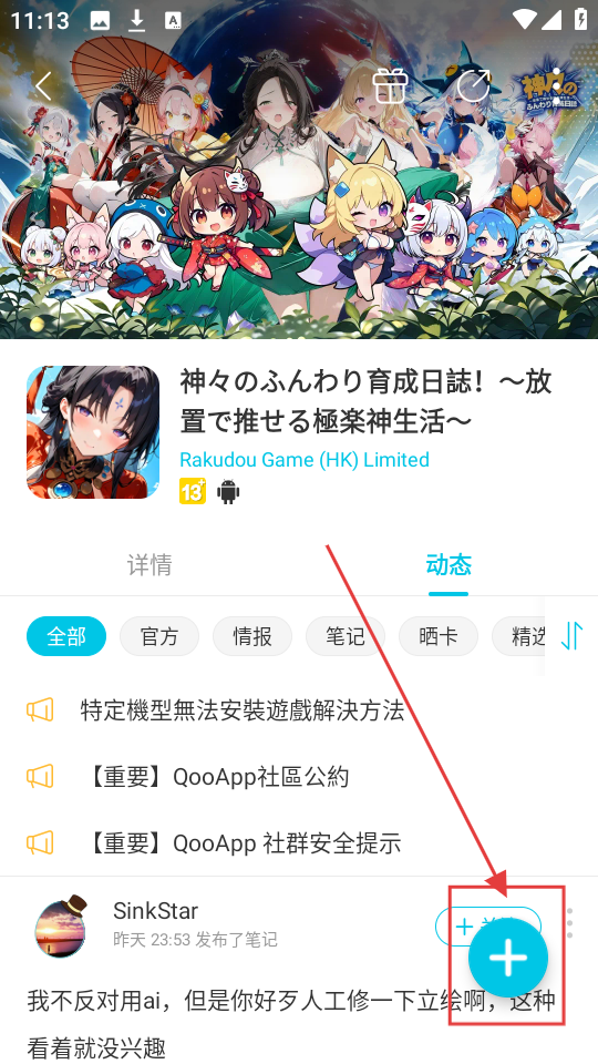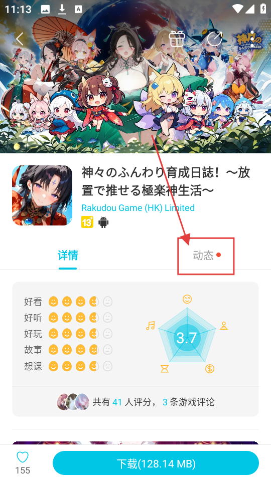 2、进入游戏详情页后,点击【动态】,就能查看游戏的最新动态和玩家分享啦。