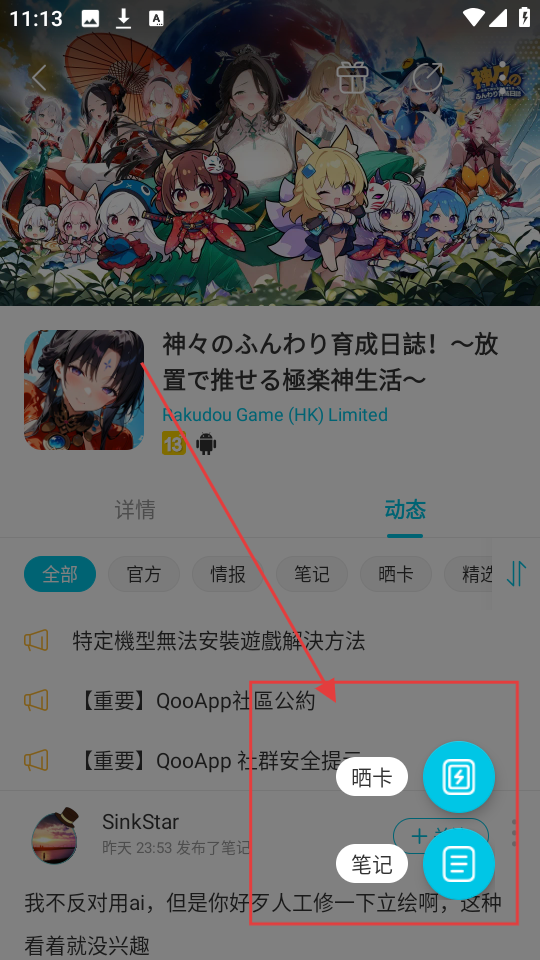 4、选择【晒卡】或【笔记】,就能发布自己的游戏内容,和其他玩家交流啦。